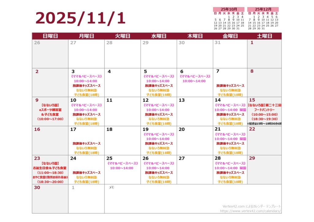 営業カレンダー 2023 02/09 Updated 2025.10.23 2023 02/09 Published 2023.02.09 / nponanairoshien@gmail.com ※年間行事予定 1月 ランドセル購入費用支援 お正月おやこ食堂 2月 節分おやこ食堂 3月 ひな祭りおやこ食堂 4月 中学・高校入学お祝い金 5月 子どもの日おやこ食堂 6月 7月 七夕&土用の丑の日おやこ食堂 8月 NPO法人なないろ支援決算月 夏祭りおやこ食堂 9月 決算・活動報告 10月 おやこ食堂BBQ 11月 12月 絵本購入費用支援 クリスマスおやこ食堂