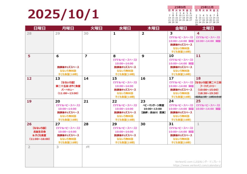 営業カレンダー 2023 02/09 Updated 2025.09.27 2023 02/09 Published 2023.02.09 / nponanairoshien@gmail.com ※年間行事予定 1月 ランドセル購入費用支援 お正月おやこ食堂 2月 節分おやこ食堂 3月 ひな祭りおやこ食堂 4月 中学・高校入学お祝い金 5月 子どもの日おやこ食堂 6月 7月 七夕&土用の丑の日おやこ食堂 8月 NPO法人なないろ支援決算月 夏祭りおやこ食堂 9月 決算・活動報告 10月 おやこ食堂BBQ 11月 12月 絵本購入費用支援 クリスマスおやこ食堂