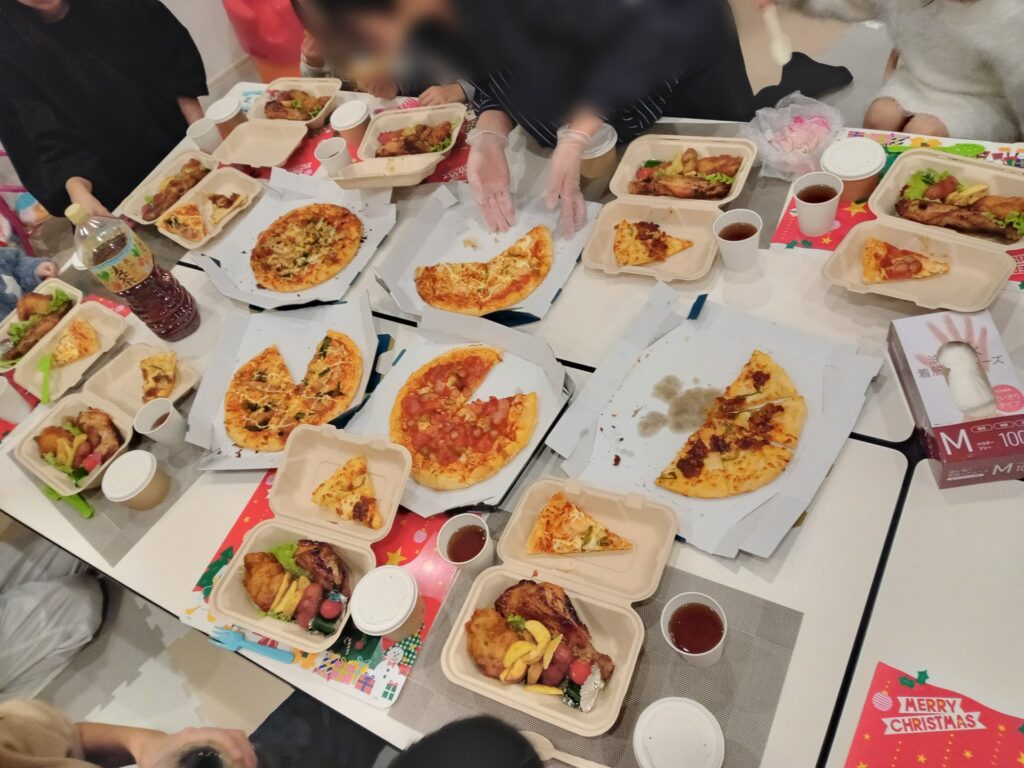 今回のおやこ食堂はクリスマスパーティーって事で、メニューはピザ🍕・フライドチキンやローストチキンなどのオードブルとケーキ🍰でした🙋🌟