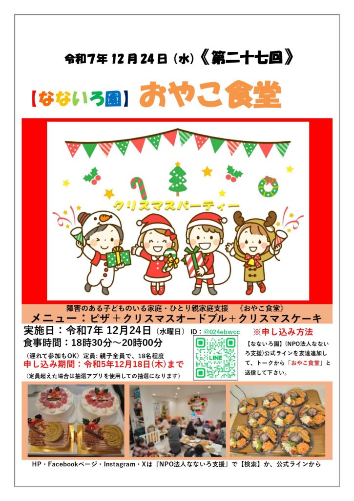 令和7年12月24日(水)に第二十七回なないろ園おやこ食堂《クリスマスパーティー》を実施致しました🙋❗